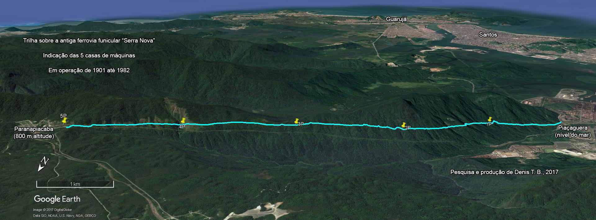 Trilha sobre as ruínas da Serra Nova em 2017 com a indicação dos 5 patamares. Logo abaixo da trilha, note o traçado da Cremalheira, antiga Serra Velha. (clique na imagem para aumentar)